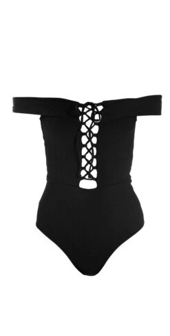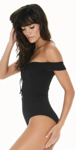The Anja by L Space is an off the shoulder one piece in a solid black featuring a soft ribbed material and a super sexy deep plunge, with a lace up detail that ties at the center. This suit offers a higher cut thigh and moderate bottom coverage.