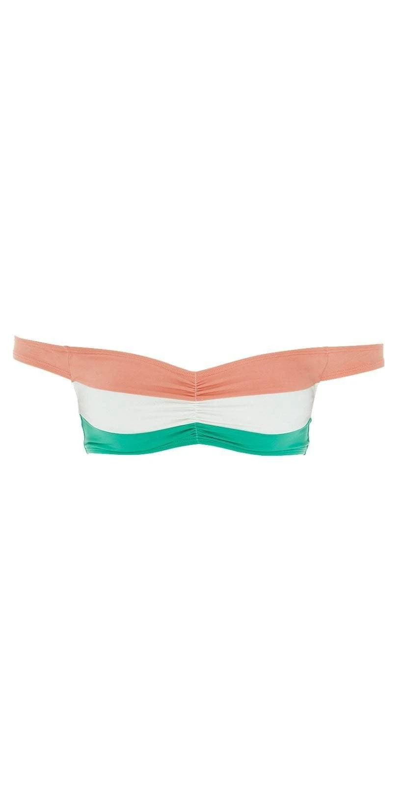 The L Space Color Block Ziggy Top in Spearmint is an off the shoulder bandeau top with a green, peach and cream color block design and a cinched middle to give it a flirty look. Features a no metal, hook or tie design for that cozy pullover style, pairs so perfect with the Veronica Bitsy Bottom!