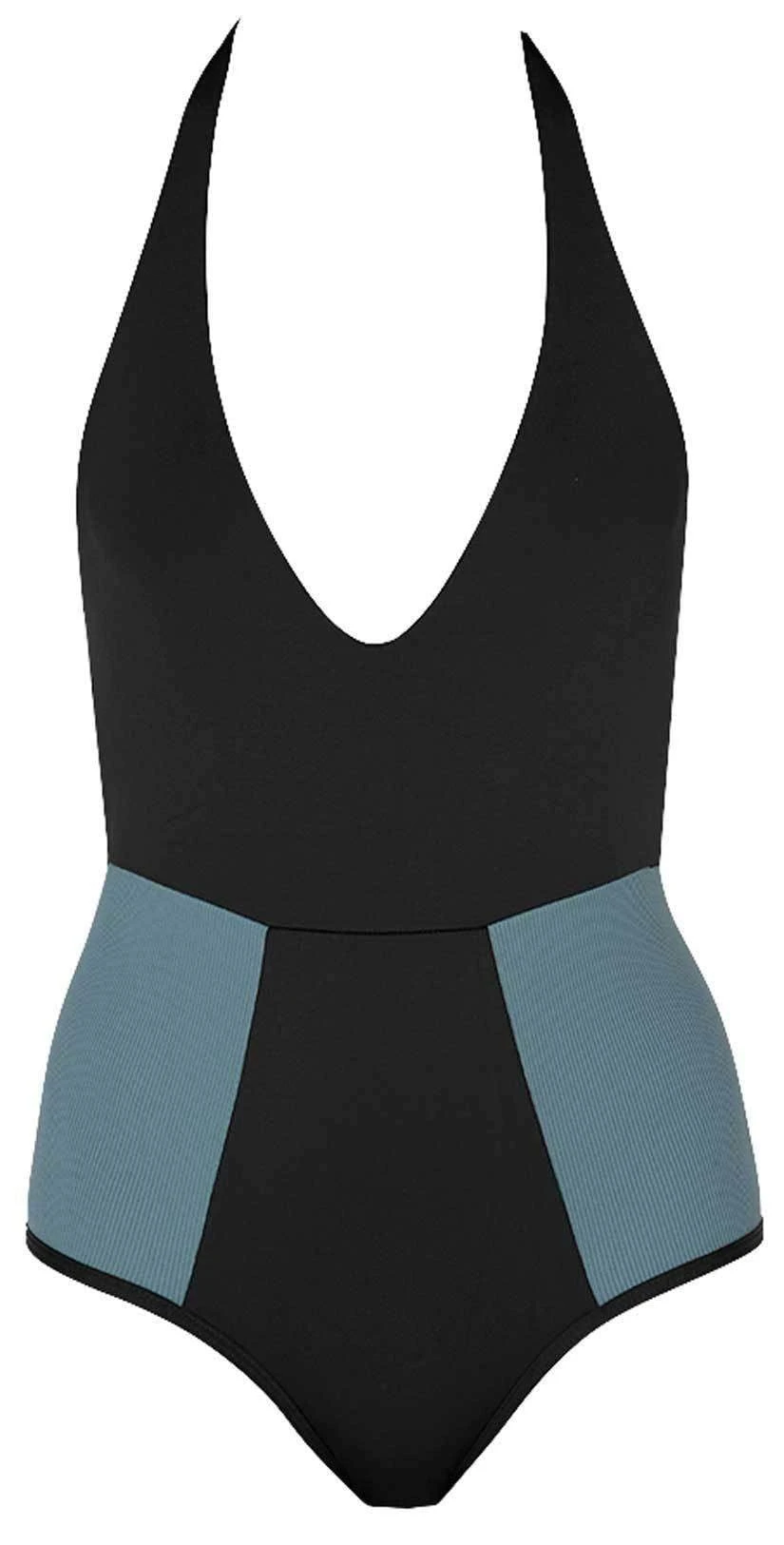 The L Space Fireside One Piece in Black and Light Turquoise features a super sexy plunging V-neckline, halter straps tie at the neck and back, slimming black and green mesh panels at the hip, a deep scoop back, and cheeky bottom coverage.