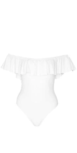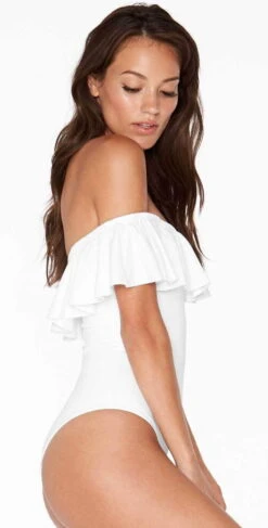 The L Space Kimora One Piece in White features a form-fitting, off-the-shoulder silhouette with ruffle detail along the neckline. This suit offers a scoop back and cheeky bottom coverage.Â