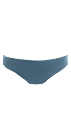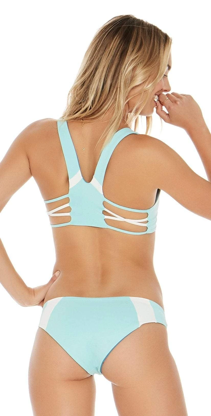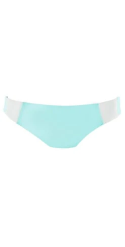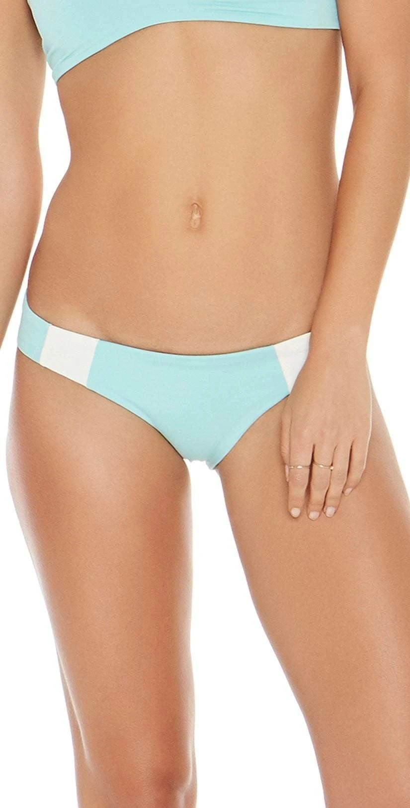 The L Space Mia Color Block Bottom in Light Turquoise is a hipster bottom that features white stripe details on the hips and reverses to a solid dark green. This bottom offers a cheeky cut in back and pairs perfectly with L Space Rylie Color Block top.