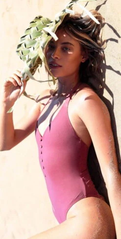The L Space Stella One Piece in Sahara features a plunging v-neckline with a button up detail and a high cut thigh. This one piece swimsuit offers moderate bottom coverage.