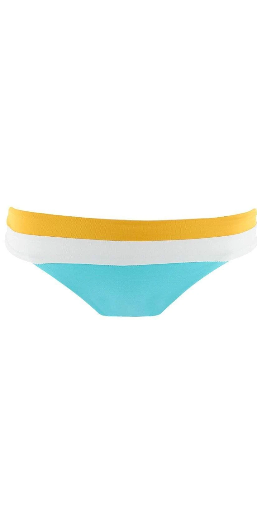 The L Space Veronica Color Block Bottom in Aruba features a blue, gold and white color block design with a wide band for a fold over look. Featuring cheeky coverage and seamless construction, these bottoms are sexy, comfortable and fun! Pair them with the matching Rylie Top!
