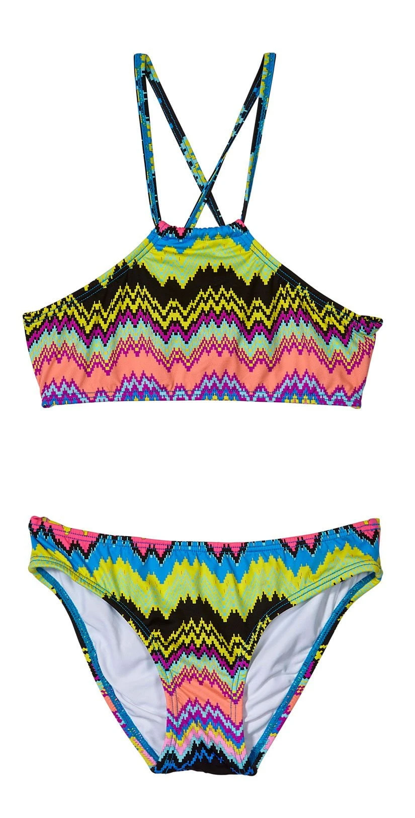 The Girl’s Clara High Neck Bikini Set by PilyQ features a high neck halter top with criss-cross back straps paired with a matching full cut bottom in an adorable multi-color zig-zag print.