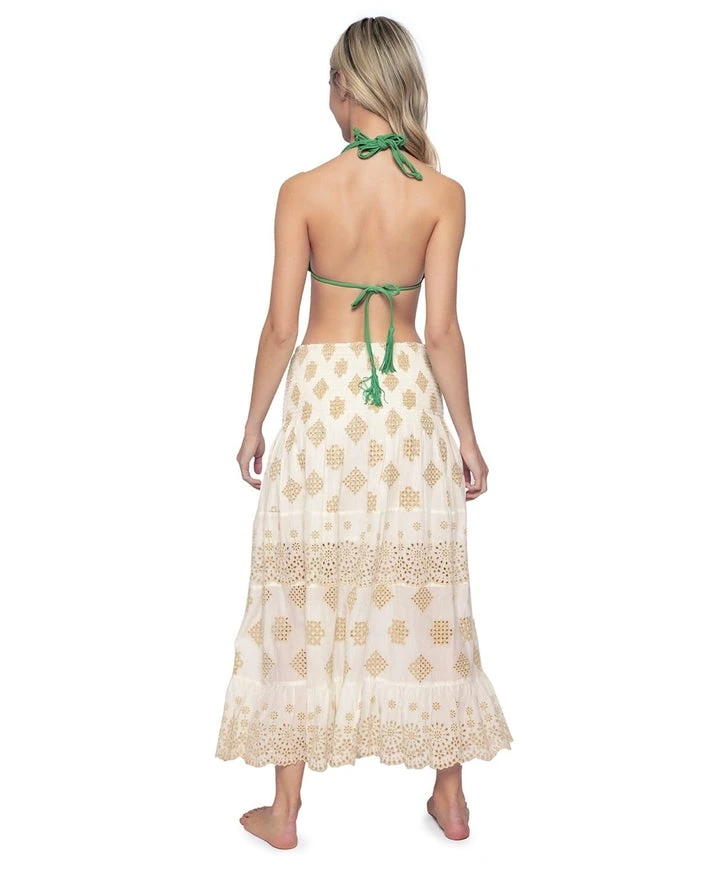 A cute PQ Swim cover up that can be worn as a skirt or strapless dress. Features smocked detailing and a ruffle trim as well as unique stitching and embroidered details.Â