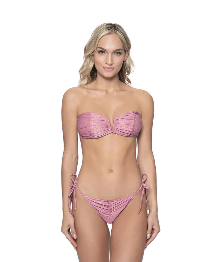 These PQ Swim side tie bottoms in Namaste feature gold accent beads and a ruched front and back. Pair it with the PQ Swim Namaste Ruched V Bandeau to complete the set!