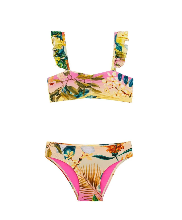 the Best Selling PQ Swim Flutter bikini now offered in Oasis! Features a ruched top and ruffle straps that are not adjustable. Moms can match their daughters in one of the PQ Swim Oasis suits for adults! If unsure about what size to pick, size up.