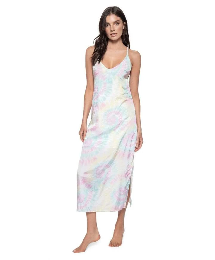 The Ella dress is a classic midi-length slip dress with a side slit. Features an elegant pastel tie-dye print and crossed straps that tie in the back.