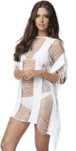 This PilyQ Water Lilly Monique Cover Up in White is chic and daring with sexy shirred cut out details throughout for hints of skin and a fringe bottom hemline. This cover-up will look gorgeous over any PilyQ suit!