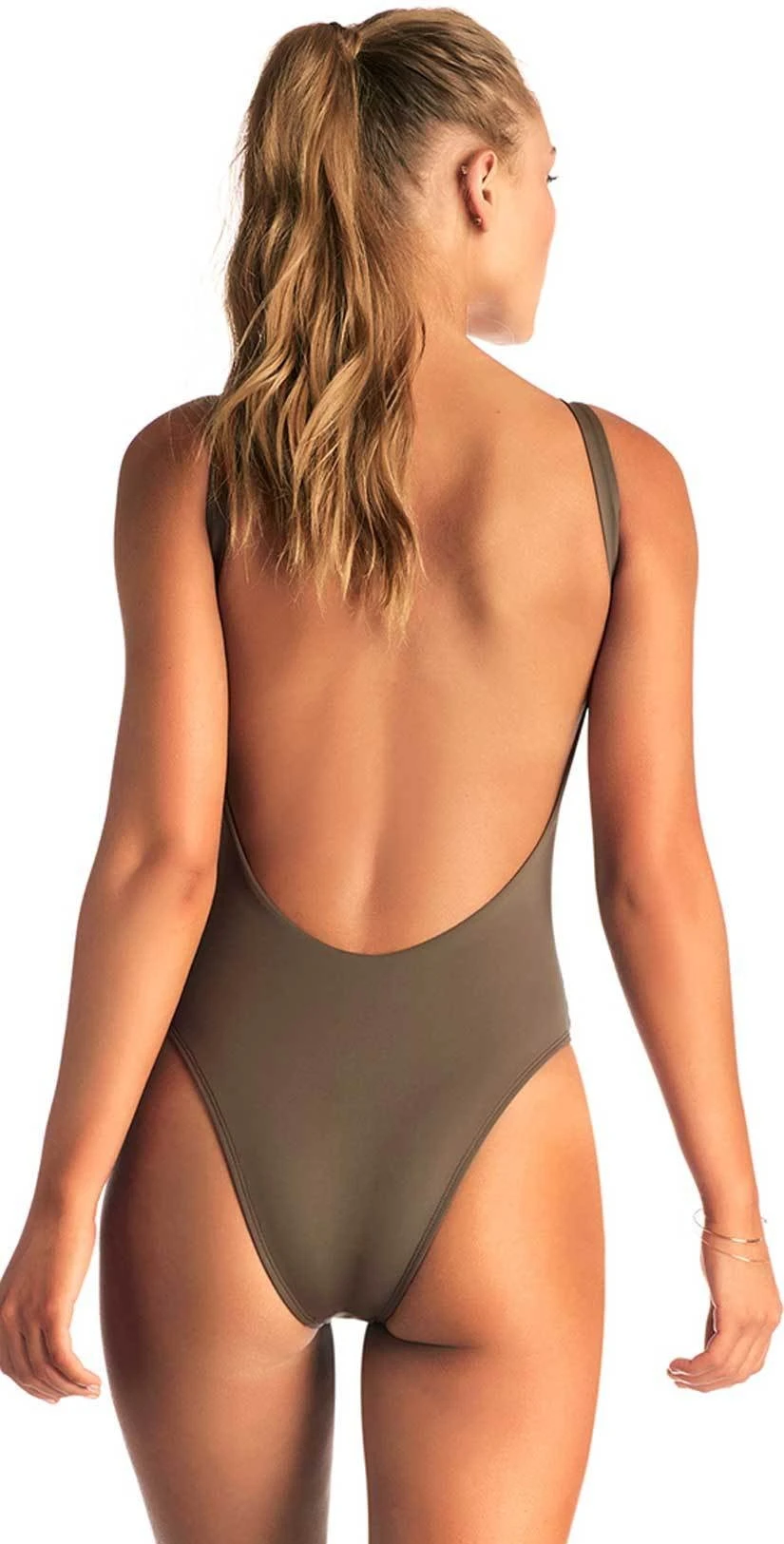 This Vitamin A Leah One Piece Bodysuit in Wildwood offers a scoop neck, high cut thigh, a low scoop back and cheeky bottom coverage. This simple, sexy one piece is a must-have addition to your swimsuit collection!